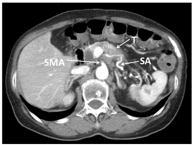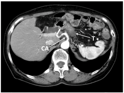 Figure 2 Abdominal CT showed locally advanced cancer of the body of the pancreas. The tumor (T) had infiltrated into the celiac axis (CA), splenic artery (SA), superior mesenteric artery (SMA) and perineural invasion into the surrounding nerve plexus was also observed.