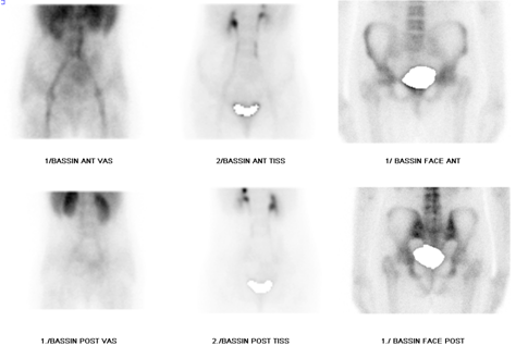 We report herein the case of a 45-year-old female patient who underwent osteosynthesis by double percutaneous screwing following a Garden III-classified left femoral neck fracture occurring during a public road accident. The evolution was marked 02 years later by the appearance of mechanical pain, progressive, with functional impotence localized in the left hip, crural irradiation. Standard pelvic-centered x-rays were negative, motivating the request of a bone scan looking for ONFH. The patient underwent a three-phase pelvic-centered bone scan after IV injection of 740 MBq (20 mCi) of 99mTC-HMDP followed by a whole body scan and complementary pelvic-centered SPECT – CT with a Siemens gamma camera model Symbia T6 2010.