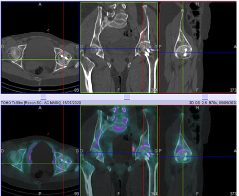 Bone scintigraphy is a sensitive but not very specific examination in the diagnosis of ONFH. The advent of hybrid imaging has significantly improved its diagnostic performance.7,8 In our patient, a three-phase bone scintigraphy and complement by SPECT CT made it possible to confirm ONFH and to stage the bone lesions thanks to the Arlet and Ficat classification, thus making it possible to evaluate the prognosis, thus orienting the therapeutic decision. In the weeks following the diagnosis of ONFH the patient underwent surgery by left hip arthroplasty with a favorable outcome.