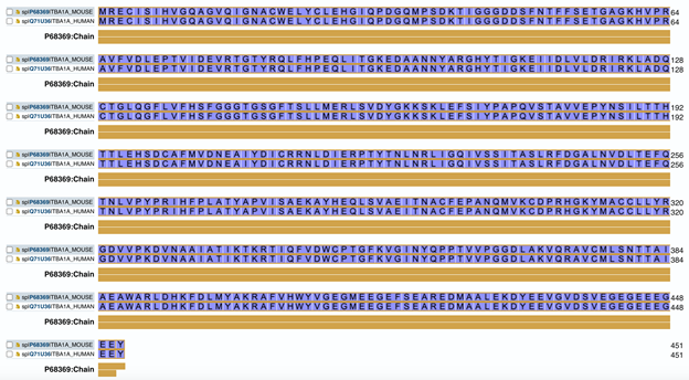 Figure 1 Results of alignment of murine tubulin alpha 1A chain (upper line) and human tubulin alpha 1A chain. Alignment of murine and human tubulin alpha-1B chain gave identical results.