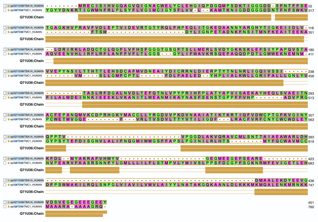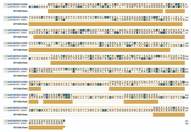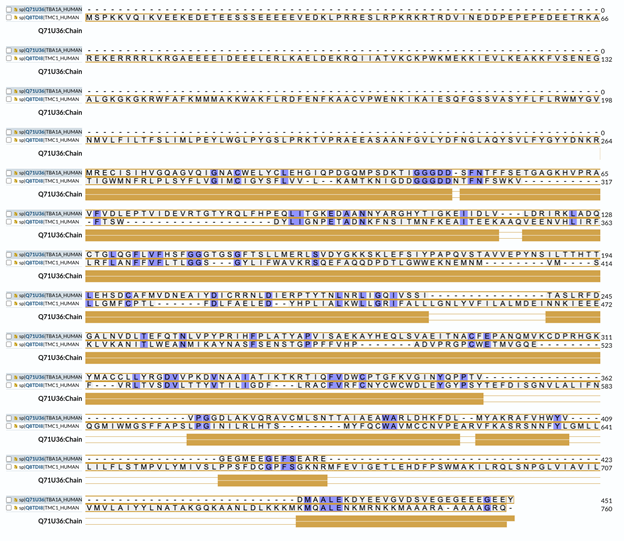 Figure 4 Results of alignment of human tubulin alpha 1A chain (upper line) and TMC1. The amino acids that occur more frequently in alpha-helices are highlighted (Pace and Scholtz 1998).
