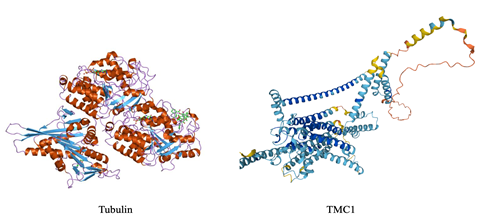 Figure 5 Secondary structure of human tubulin (cartoon representation of the molecular structure of protein registered with 1ia0 code by Jawahar Swaminathan and MSD staff, https://www.ebi.ac.uk/), and human TMC1 (Ruggiero, https://www.uniprot.org/uniprotkb/Q8TDI8/entry).