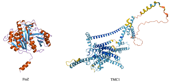 Figure 8 Secondary structure of bacterial FtsZ (cartoon representation of the molecular structure of protein registered with 1fsz code by Jawahar Swaminathan and MSD staff, https://www.ebi.ac.uk/) and human TMC1 (Ruggiero, https://www.uniprot.org/uniprotkb/Q8TDI8/entry).