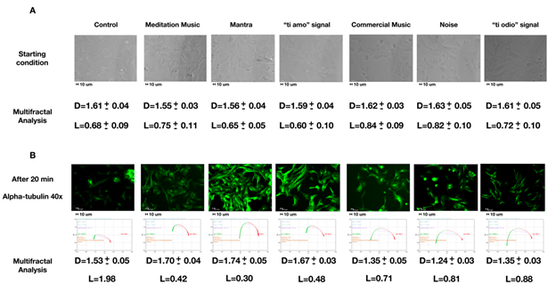In the study of Dal Lin et al.5 the murine atrial cardiomyocyte cell line HL1 was stimulated with a series of audible sounds for 20 min and tubulin behavior was studied by immunofluorescence. Among the different stimuli, a meditative phoneme of two syllables (mantra) induced the greatest increase in average fractal dimension and the greatest decrease of lacunarity (Figure 9).
