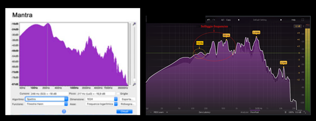 Figure 10 Left panel: sound analysis reproduced from Figure 3 of Dal Lin et al. (2021) under the terms and conditions of the Creative Commons Attribution (CC BY) license https://creativecommons.org/licenses/by/4.0/. Right panel: sound analysis using a FabFilter Pro-Q3 high quality equalizer. Nam-Myoho-Renge-Kyo chanting at Taisekiji Temple in Japan (https://www.youtube.com/watch?v=p2F488BV3oA). The frequency at 116 Hz is indicated by a yellow circle. The area of the solfeggio frequencies is indicated by a red circle.