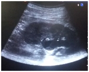 Patient was placed in the prone position, cleaning and draping of the region was done and skin infiltrated with 1% lignocaine. Following an incision with surgical blade (no 11) puncture needle (18/21 gauge) was introduced into the dilated pelvicalyceal system (PCS) under real time USG guidance using a trans abdominal convex probe of 4-9MHz Figure 1. Urine/pus was aspirated on PCS access for culture and sensitivity.