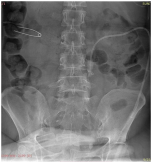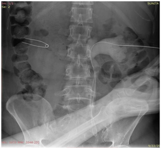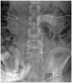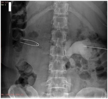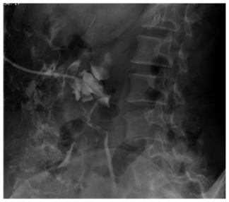 Precise point of entry was confirmed by a performing a nephrostogram and once the access into target calyx was confirmed the needle was exchanged over 0.035 Terumo guide wire. The tract was serially dilated, catheter introduced and guide removed after confirming correct placement of catheter tip. The nephrostomy tube was secured and urobag attached. Post procedure nephrostogram was performed Figure 2.