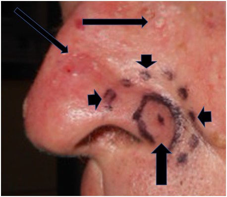 Figure 2B Left lateral projection with thick horizontal black arrow showing biopsy proven BCC. Thin black arrows show surrounding actinic change amongst hamartomatous change.