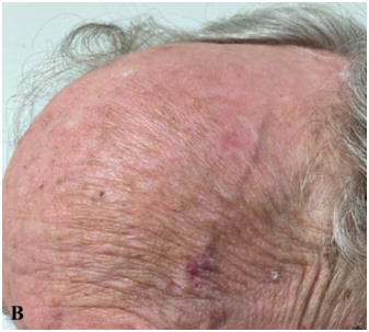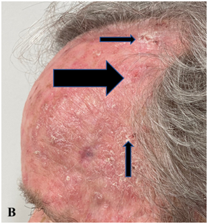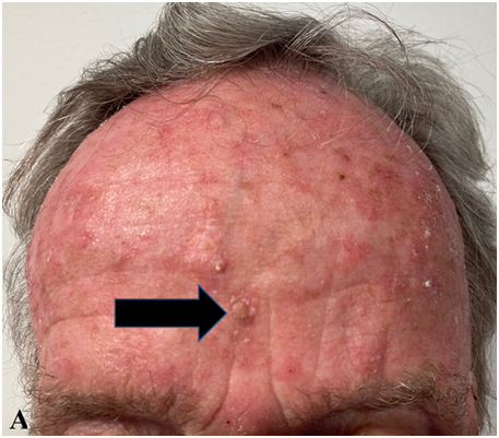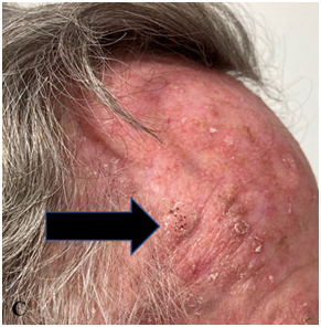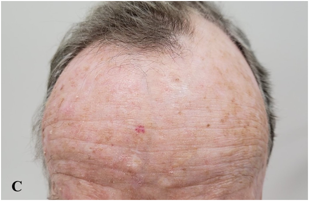Figures 2A-C: Forehead at presentation showing hamartomatous change, active BCC and surrounding actinic change.