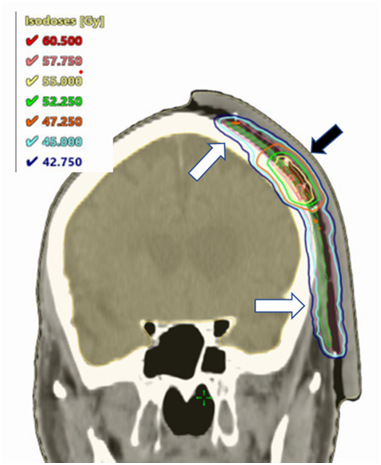 Figure 4 Coronal dosimetry of VMAT volume for left temple, planned in Eclipse V15.6 planning system (Varian Medical Systems, Inc., CA, USA). White arrows show PTV45 doses. Black arrow shows PTV55-SIB doses.