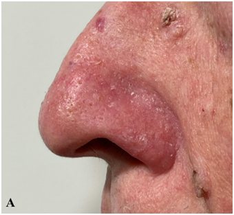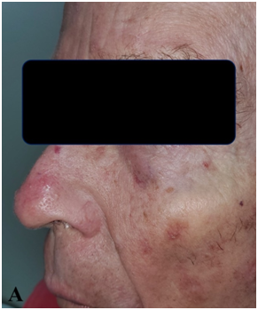 On examination, he had macrocephaly and hamartomatous skin typical of PTEN mutation. Our patient described using topical treatments for symptomatic relief of his hamartomatous skin, providing only temporary relief. He also described having skin that burns very easily when in the sun (compared to others with similar Fitzpatrick skin type), despite the use of sun protection from early adulthood. He had BCCs with a left nasal alar lesion (Figure 1), and a scalp lesion within a field of actinic damage (Figure 2A-C). He had a RT consultation and, while the usual side effects were also described, the radiation oncologist (RO) (GBF) explained that, due to the paucity of research in the area, there was no way of knowing what sort of normal tissue reactions the radiation would induce in the context of a PTEN mutation. It was further discussed that the mutation may predispose to more serious acute and late reactions, and that there may be need to take a treatment break, or even curtail the treatment at some point to reduce the toxicity. His treatment was planned as per department protocol (Figure 3). The nasal alar was planned with superficial RT (SXRT) and the forehead was planned with a field-based volumetric modulated arc therapy (VMAT) technique with a simultaneous integrated boost (SIB).