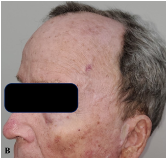 Following the completion of treatment course, the patient developed the expected desquamation, erythema and mucositis within the nasal field and desquamation and erythema in the left temple. The radiation side effects were not dissimilar to the toxicities expected in patients without a documented PTEN mutation. It appeared that the PTEN mutation had no visible increase of the acute side effect profile. He returned in 4 weeks demonstrating resolution of his cancers, field change and acute RT toxicity (Figure 5A-B). There was no unexpected acute toxicity. After more than 6 months, the areas treated with RT remained clear of hamartomas with no late toxicities (Figure 6A-C).