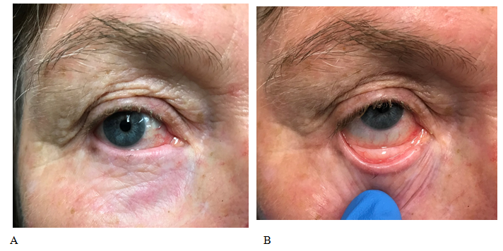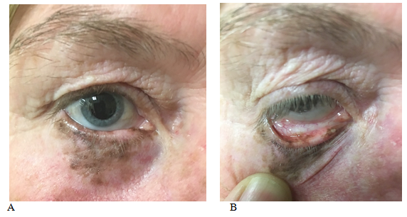 Figure 1 Pre-radiotherapy. Lentigo maligna involving. (A) The external. (B) The internal surface of the right lower eyelid.