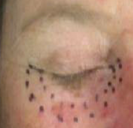 A 52-year-old woman presented with progressive pigmentation of the right lower eye lid over several years which had significantly worsened over the previous twelve months. Examination revealed a lesion involving the cutaneous and conjunctival surface of the lower eyelid (Figure 1). Histopathology of multiple incisional biopsies (both cutaneous and conjunctival) is confirmed melanoma-in-situ, which is also known as lentigo maligna (LM) or Hutchinson’s melanotic freckle (HMF). Given the extent of the lesion and the likely morbidity from surgical excision and reconstruction, the patient was referred to radiation oncology for an opinion. At the initial consultation, she was considered suitable for radiotherapy treatment. She consented to treatment and underwent planning immediately following her initial consultation (Figure 2).