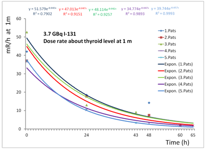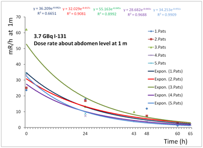 Figure 2 The time dependent dose curves for each therapeutic value of 3.7GBq were generated by exponential fitting curves for each of 5 patients about thyroid level at 1m.
