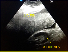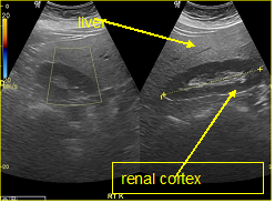 In a 4-years period (from 2016 to 2019) a retrospective study of 887 patients with fatty infiltration of the liver was performed, out of which 608 were males and 272 were females, aged 42 to 69 and 7 obese children (age from 8 to 13 years). All patients were examined in the ultrasound cabinet of our hospital (hospitalized, regular appointments and emergency incidents) and subjected to upper abdominal ultrasound scan, with convex transducer 4C MHz, in three ultrasound imaging planes: transverse, oblique and sagittal planes.5−7 In order to better depict the liver, especially in obese patients or those with excessive intestinal gas, the patients were asked to inhale deeply and hold their breath for the duration of the ultrasonographic examination for a few seconds at a time, so that the liver could be visible in its entirety. The ultrasound examination revealed the echogenicity of the parenchyma of the liver and was compared with the parenchyma of the right kidney, the spleen and the pancreas (Figure 1−3). Τhere is always the risk of missing a diagnosis of mild hepatic steatosis on ultrasound if there is concurrent chronic renal disease, which increases the echogenicity of the kidneys (Figure 4), if there is any doubt that the patient might have a chronic renal disease, comparison of the liver to the left kidney and the spleen may be useful.8