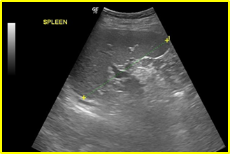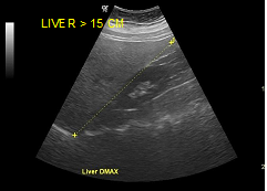 The fatty infiltration of the liver is shown on ultrasound with significantly increased echogenicity "bright liver", in comparison with the right kidney cortex (Figure 1). Normally, the liver and the renal cortex have similar echogenicity, relative to the parenchyma of the pancreas and the spleen. The maximum diameter of the liver in the midclavicular line (MCL) was increased, right lobe>15 cm (Figure 5). Also significant features are the absence of mass effect on intrahepatic vasculature (Figure 6) as well as the poor visualization of the deep parts of the liver (Figure 7), due to decreased permeability of the acoustic beam. A focal or diffuse morphology has been shown to increase the echogenicity of the fatty liver. Differential diagnosis is caused by focal fat infiltration (Figure 8), which has a geographic distribution. In this case, hypoechoic areas correspond to normal hepatic parenchyma on fatty infiltration sites, whereas, normal parenchyma islets can easily be identified due to their typical positions, in front of the right branch of the portal vein, its division, around the area of the gallbladder and the caudate lobe.9−13