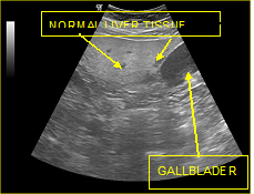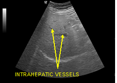 Normal echogenicity of liver parenchyma, normal visualization of the diaphragm and intrahepatic blood vessels.