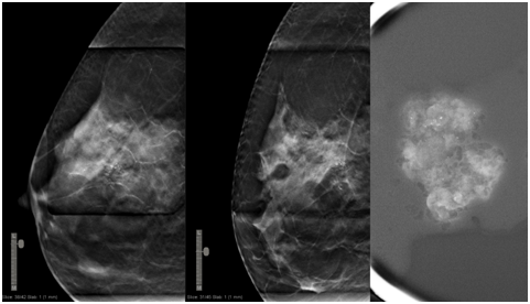 We included all patients who underwent DBT-guided VAB from November 2015 through May 2017, a total of 200 patients. A Selenia Dimensions system (Hologic) was used for all patients. The patient was placed into compression in the direction from which the needle would traverse the shortest amount of breast tissue, with a fenestrated paddle. In case of thin breast and superficial lesions we performed rolled views that allows the possibility of generate virtually more depth to the target and more thickness to the breast. Then the technologist compressed the breast. Lidocaine (1% buffered with sodium bicarbonate) was used for local anesthesia, and a larger gauge needle (ATEC 9 or 12-gauge needle) was placed at the selected target with DBT, delivering 100-300mg of tissue per sample. The notch where the sample is taken is variable (12mm or 20mm). Radiography of the specimen was routinely performed while the patient remained in the biopsy position. Finally, if we removed all microcalcifications we placed a clip marker into the biopsy site.