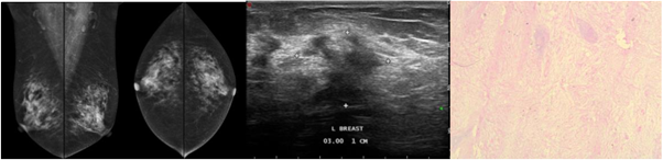 Mammography showed asymmetric density in left breast. US showed irregular hypoechoic mass, taller than wider, which on doppler showed no intravascularization, BI-RADS: C5.