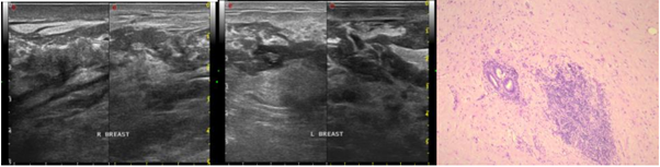 There were no discrete mass detected on US, but it showed extended tissue distortion in all breast quadrants with skin thickening and wide edema. Lymph nodes enlargement also found on US, suggesting mastitis with differential diagnosis of inflammatory breast cancer. Core biopsy revealed no malignancy and consistent with features of DMP (Figure 3).