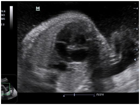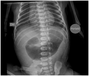 Newborn female was born at 37 weeks 5 days as a product of a second pregnancy, with prenatal diagnosis of duodenal atresia and esophageal stenosis (Figure 1). Due to a previous cesarean section and rupture of the membranes, an emergency caesarean section was performed. Birth weight was 2100 grams APGAR scores were 8–9 at…min. A thoracic-abdominal radiograph was performed, showing thorax without alterations and an image suggestive of duodenal atresia (Figure 2). An echocardiogram CIA 0.5, PCA: 0.2X0.3 showed mild dysplasia of aortic and pulmonary valves. Abdominal laparotomy at 24hours of life, revealed duodenal stenosis secondary to annular pancreas, intestinal malrotation and non-meconium plastic peritonitis without evidence of perforation. The defect was corrected by adhesiolysis, duodeno-duodenal anastomosis and incidental appendectomy.