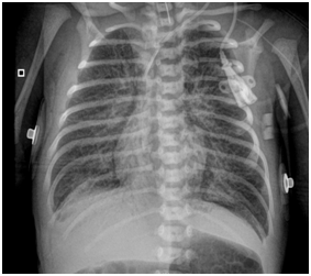 However, on day … episodes of desaturation appeared with an increase in FiO2 and ON up to 40ppm, and the patient remained under sedation. On the sixth day, milrinone was added to improve perfusion at the pulmonary level and norepinephrine was reinitiated to increase systemic blood pressure. In addition, a dose of surfactant was administered, chest radiography showed bilateral parahiliar interstitial infiltrate, peripheral pulmonary vasculature increased, and decrease in left cavities (Figure 3). Nevertheless, within a few hours she had bradycardia and hypotension, and a new echocardiogram was performed, evidencing right chambers failure and an advanced resuscitation was initiated with drug administration and cardiac massage without obtaining a response, causing patient´s death. The transfontanelar scan was normal. A karyotype was done with a normal report (46,XX).