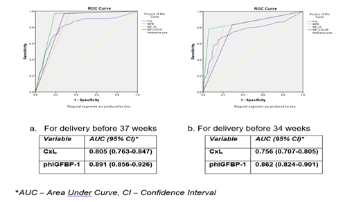 Results: 468 patients completed the study. Statistical analysis of sensitivity, specificity, PPV and NPV showed that phIGFBP-1 was a better predictor of preterm birth compared to cervical length. There was very good correlation of phIGFBP-1 for prediction of delivery in the crucial period of next 7 days with a kappa of 0.833 (0.780-0.886). Cervical length and phIGFBP-1 were shown to be independent predictors on multivariate regression analysis.