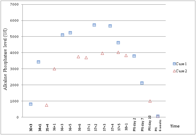 Two low-risk primigravida age 29 (patient A) and 20 (patient B) years attended at around 36 weeks pregnant due generally feeling unwell. After general examination and investigations, single significant elevation of serum ALP concentration was detected (5122 and 3017 U/litre respectively).