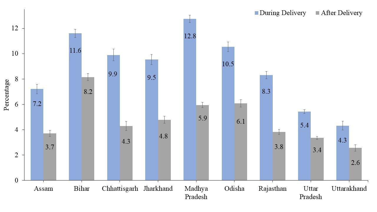 Figure 1 presents the prevalence of excessive vaginal bleeding during and after delivery in high focus states of India. In all states, the prevalence of excessive vaginal bleeding is higher during delivery than after delivery. The prevalence of excessive vaginal bleeding during delivery in the high focus states ranged from 4.3 percent in Uttarakhand to 12.8 percent in Madhya Pradesh. While the prevalence of excessive vaginal delivery after delivery ranged from 2.6 percent in Uttarakhand to 8.2 percent in Bihar. States like Madhya Pradesh, Bihar, Odisha, Chhattisgarh, Jharkhand, Rajasthan and Assam have a relatively higher prevalence of excessive vaginal bleeding during delivery as compared to other states. Figure 1 also provides information on the significance of the estimates of the prevalence of excessive vaginal bleeding in the form of error bars. The narrow line of the error bar represents that the variation of the estimated prevalence of each state is not too large and reliable. It also shows that the estimated prevalence differs significantly from one state to another (Figure 1).