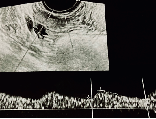 Figure 1 Ovarian artery color Doppler waveform assessed by endocavitarian probe, in the fifth day after starting menses.