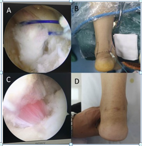 Make the posterior lateral and posterior inner portals according to the procedure described by Van Dijk et al.6 A 4.5mm arthroscopy was introduced through a postero lateral incision (Smith & Nephew, Andover, MA, USA), and a 4.5mm razor (4.5mm incisor with Elite blade, Dynomics arthroscopic surgical blade, Smith & Nephew, Andover, MA, USA) was introduced through the postero medial entrance. The razor is introduced medially to laterally, carefully keeping the instrument on the posterior neurovascular bundle and lateral to the FHL tendon. Identify the FHL tendon. The deep calf fascia, located behind the FHL tendon, is divided into tendons lengthways proximally, from the distal edge of the lateral margin of the FHL tendon to about 5cm above the talocral joint. This is done to reduce the Angle of the FHL tendon when the tendon is transferred to the calcaneal tubercle. The flexor retinal is cut along its lateral margin to the bone to open distally and reveal the FHL tendon as far as possible (Figure A). After the preparation of the FHL tendon, prepare the area of the anterior calcaneal tuberosity of the Achilles tendon. Through a proximal accessory posterior medial gate, a wire is drilled into the calcaneus and points to the midline slightly lateral to the underside of the foot, behind and near the Achilles tendon. The position was controlled by fluoroscopy. The bone tunnel was drilled with a 7mm hollow drill, and a plantar incision was made at the bone tunnel. After the preparation of the FHL tendon and bone tunnel, the ankle joint and the hallux were plantar flexed; The FHL tendon is tensioned and severed endosco pically as far as possible within the fibrous bone tunnel. Care must be taken to maintain the medial side of the FHL tendon to avoid injury to the neurovascular bundle. If necessary, an auxiliary proximal portal vein can be made to clamp the FHL tendon. The proximal FHL tendon stump was pulled out through the posterior medial gate and propped with a needle before the temporary stay suture was applied (Figure B). The tendon stump was reintroduced with temporary stay suture to the rear foot.