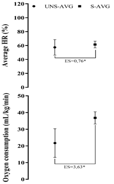 HR and oxygen consumption during the test session showed a strong correlation for UNS-AVG (R2=0.968, P=0.008) and S-AVG (R2=0.992, P= 0.002) groups. (Figure 1) shows HR and oxygen consumption comparisons between UNS- and S-AVG groups. Average HR (t=−4.15, P=0,025, %Δ=7.1) and oxygen consumption (t=−5.12, P=0.002, %Δ=69.5) were greater for S-AVG compared to UNS-AVG. Very large effects were found for maximal HR and oxygen consumption in relation to the AVG type (Figure 1).