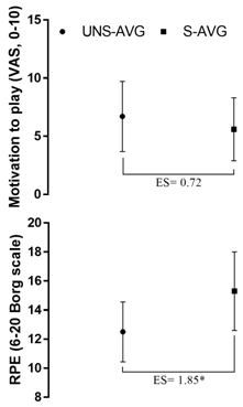 Results: Average HR (%Δ=7.1, P=0.025, ES=0.76) and oxygen consumption estimated (%Δ=69.5, P=0.002, ES=3.63) during the sessions were greater for S-AVG compared to UNS-AVG. Motivation to play was similar between groups (%Δ=18.2, P=0.685, ES=0.72). RPE was greater for S-AVG compared to UNS-AVG group (%Δ=20.6, P=0.045, ES=1.85).