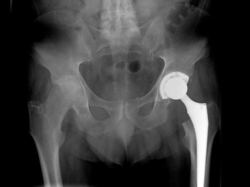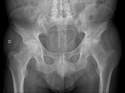 An X-ray of the hip revealed advanced bilateral osteoarthrosis, classifying both hip joints as grade 3 according to Tonnis' classification (Figure 2).