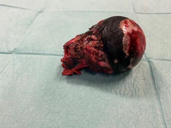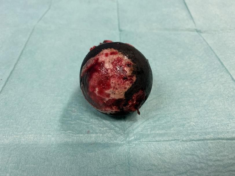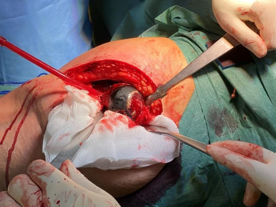 A total hip arthroplasty on the left was proposed and accepted, during which the presence of ochronotic osteoarthropathy was confirmed, with dark staining of the cartilage and articular capsule, as well as of the surrounding ligaments (Figures 3–5).