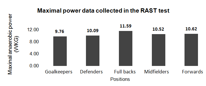 In a work comparing the players' positions and the power during the RAST test in relation to the maximal power, full backs had the highest values followed by forwards (Figure 1).19