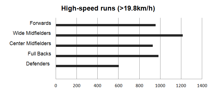 Fractioning the 90 minutes of the match, a study of the Premier League showed that, during high-speed runs (>19.8km/h) in a match, the actions decrease throughout the match due to the athletes’ fatigue. The first 15 minutes of the match concentrate most of the intense moves. We can find some numbers referring to the position and actions (m) of the athletes in the game (Figure 2).14