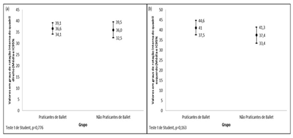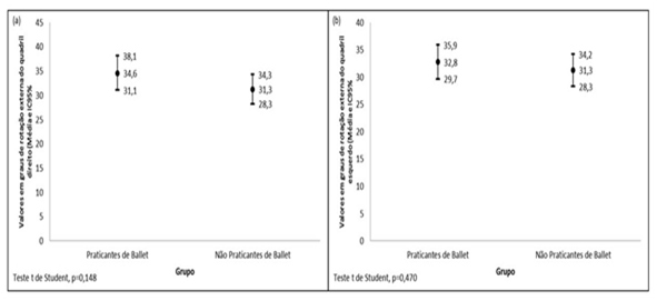 In the present study, the data collected showed that there were no significant differences between the groups of rotational degrees of hip. However, the dancers were closer to the maximum range of motion that is 45 degrees.14,22 On the other hand, there are authors who report that the internal rotation of the hip has its degree between 0 - 30/60 degrees.24