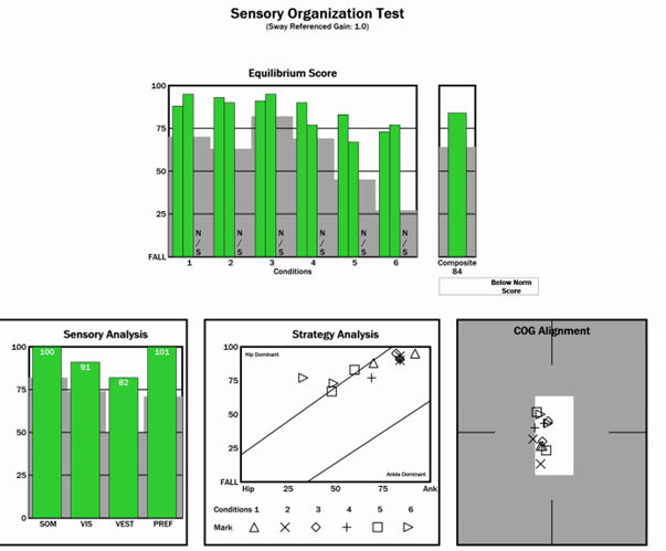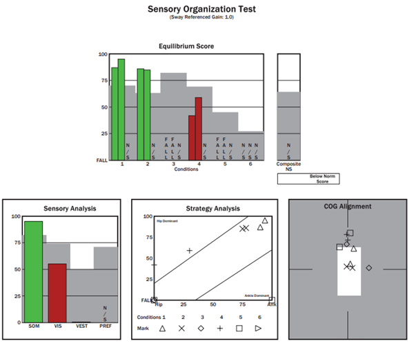 Figure 2A Baseline (pre-treatment) sensory organization test (SOT) of computerized dynamic posturography (CDP) testing shows a multifactorial pattern of disequilibrium. Of note, condition 6 was not completed due to the patient’s fatigue and falls on conditions 3-5.
