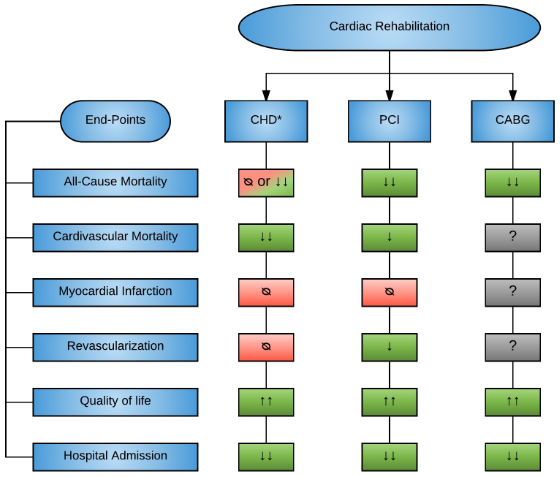 This review supports the use of CR for secondary prevention, in patients with CHD and in its different scenarios, as a Class I indication, although acknowledging that data from RCTs involving a greater number and higher risk patients would be important to consolidate it even more. Future perspectives should also focus in patient selection, inclusion and adherence to CR in order to increase the number of benefited from the programs.