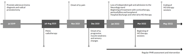 Three months after finishing radiotherapy, in November 2021, he began experiencing bilateral posterior lower leg pain that kept progressing in intensity and localization, ending up extending to the entire LL and lumbar region and affecting his functionality and quality of life. Afterwards, in December 2021, the patient started noticing progressive LL weakness and loss of independent gait. He also mentioned altered distal LL sensation and weight loss of over 10Kg in a few months.