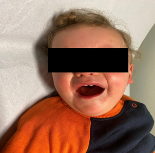 The toddler was re-evaluated 5 weeks later, where we can see a significant increase in facial symmetry at rest and when crying, as well as a greater mouth opening on the affected side, so the proposed goal of the procedure was achieved. Figure 2,3 show the face 5 weeks after the procedure, at rest and when crying respectively.