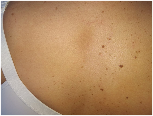 A 45-year-old female patient presented to the dermatology outpatient clinic with complaints of burning and pruritus on her back, and was referred to the physical therapy outpatient clinic with a preliminary diagnosis of notalgia paresthetica. The patient stated that she had complaints for 2 years. Physical therapy, but little benefit. A 6x8 cm hyper pigmented macular skin lesion was detected in the medial right scapula. Examination; In the evaluation of joint range of motion (ROM), neck flexion and extension were open and painless, right and left rotations were open, and end of ROM was painful. Painful fibrous bands were detected in many dorsal muscles, especially in the trapezius muscles during palpation. Sensory examination revealed hypoesthesia and paresthesia in the center of the skin lesion. There was degeneration on cervical vertebra radiographs. Pregabalin 75mg / day was started and the dose was gradually increased. Trigger points in trapezium muscles were treated with dry needling (5 sessions at 3-day intervals) Stretching the back and neck muscles and isometric exercises were given. Patient‘s clinic was significant better in the first month control.