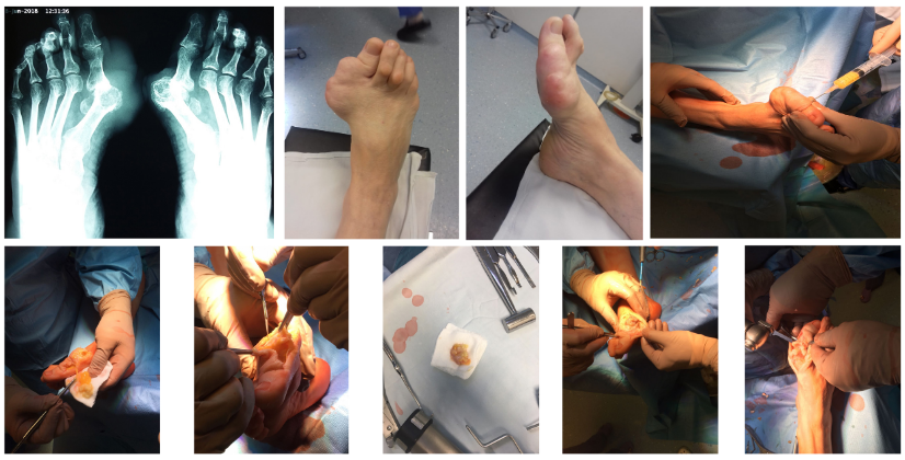 Removal of the soft tissue formation, 1 MTP joint arthrodesis, resection of the 2nd and 3rd toes bocks of the right foot.