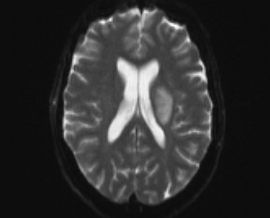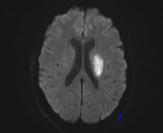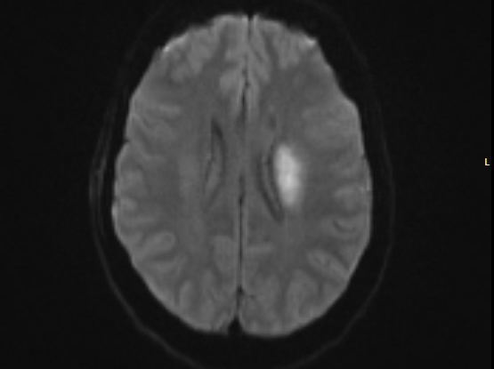 55-year-old female was admitted to our inpatient unit for neurological rehabilitation following stroke. Examination revealed right sided hemiparesis with power of 0/5 in upper limb and 2/5 in lower limb. Laboratory investigations were normal. Her lipid profile was raised. She also had an unremarkable 24-hour electrocardiogram and carotid Doppler. Brain Computed tomography and MRI scans showed left basal ganglia infarct. She was treated as an acute ischaemic stroke and commenced on rehabilitation. She was transferred to our unit to continue her neurological rehabilitation which was progressing slowly (Figure 1a –1c).