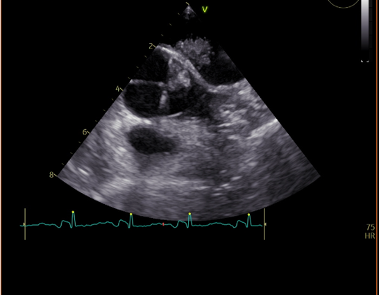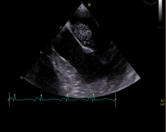 Inpatient evaluation: Transthoracic echocardiogram revealed ejection fraction (EF) of 55% and a bright mobile echogenic structure in the left atrium. Transoesophageal echocardiogram showed possible left atrial myxoma 1.3 cm x 0.96 cm. Multispecialty planning was initiated; cardiac surgeons offered her excision surgery to prevent further strokes (Figure 2a–2b).