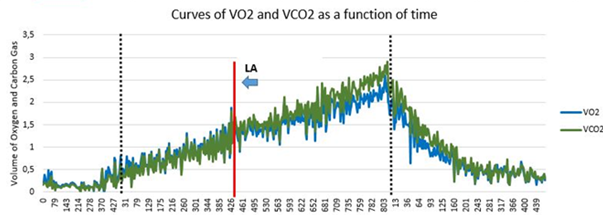 In this way, the examiner was previously trained by means of a theoretical/practical course of realization and analysis, in order to extract the data of the respiration-breathing platform of the ergometer Vmax (Carefusion®) as PDF file (Adobe Acrobat Document®, Windows 10) and perform the plotting for the EXCEL software (Windows-10), whereby, manually, it would move the LA demarcation course by the graph until the moment of loss of linearity. The Figure 1 represents the ventilatory variables VO2 and VCO2 obtained breath-to-breath, as a function of time expressed in seconds, with manual graphical analysis performed by the visual visual method.