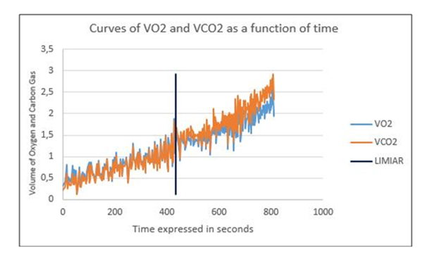 The visual ventilatory method Graph is one of the most described and used methods in the literature, which is the analysis of the variables VO2 and VCO2 obtained with each breath, as a function of the time of exercise in seconds arranged in the graph created by the examiner. This method is considered as gold standard, since it allows the observation of the moment of loss of linearity of the variables, that is, the expression of the VCO2 curve is superior to that of VO2.13,14