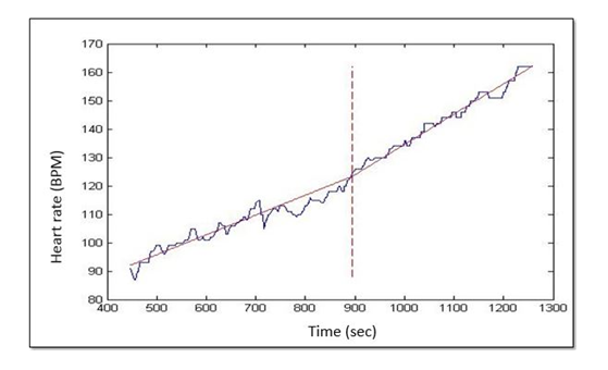 The heteroscedastic mathematical model is described as a simple linear segmented regression model, in which the function presents a dependent and an independent variable, so that according to time, random errors are calculated for estimation Of coefficients that will trace a graphic illustration of the moment when the heart rate expressed in bpm as a function of time presents its point of change.15 For this, a linear regression was sought in the literature that most resembled the data studied. In this way, specific commands for the data studied were created using Matlab 8.3, 2014 (Mathworks, Natick®) software, which determined the threshold point by means of the frequency point Cardiac. The Figure 3 shows the heart rate in beats per minute, as a function of the exercise time expressed in seconds, through the analysis of the heteroscedastic mathematical method, created by MATLAB software.